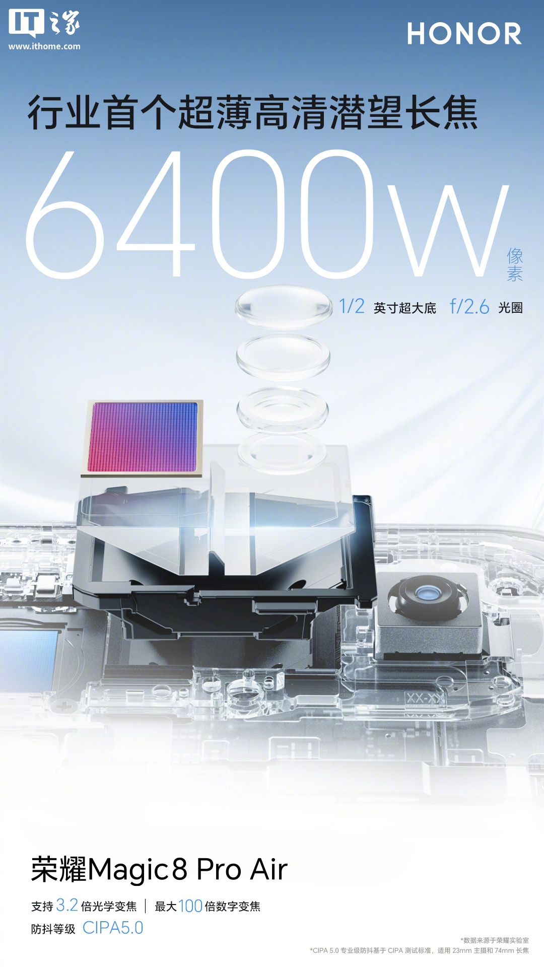 IT之家 1 月 14 日消息,荣耀手机官方今日宣布,荣耀 Magic8 Pro Air 将搭配旗舰同款大底主摄,同时推出行业首个超薄高清潜望长焦,及安卓首个 AI 变焦阵列闪光灯。具体配置信息如下:
