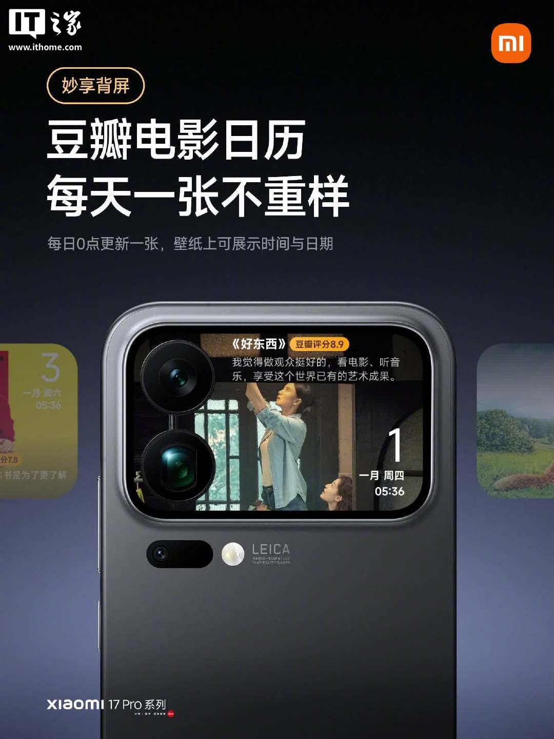 IT之家 1 月 14 日消息,小米澎湃 OS 官方微博今日宣布,小米 17 Pro 系列手机新增支持「豆瓣电影日历」壁纸功能,每日一幅豆瓣精选电影剧照,搭配经典对白。功能入口如下: