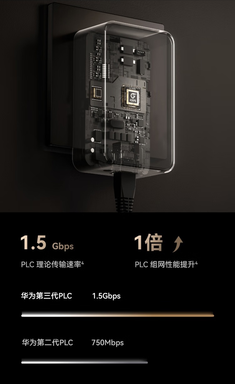 另外,该路由采用华为第三代 PLC 技术,搭载全新凌霄 PLC 芯片,利用电线传输信号,子路由房内插上电,即可实现自动组网,无需布线。