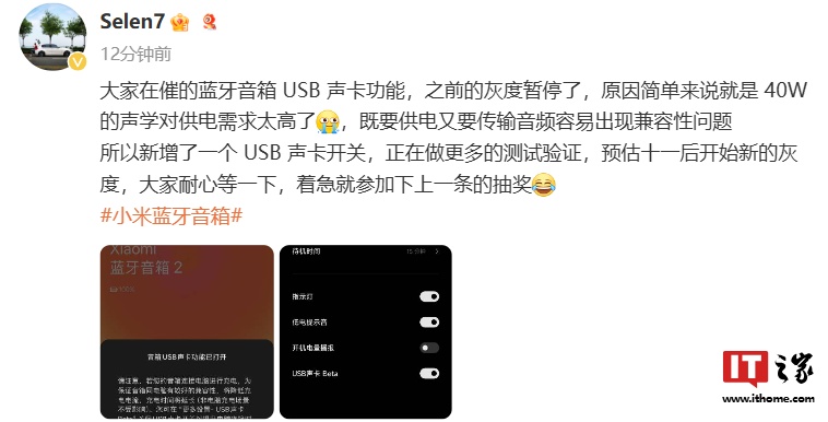 IT之家 9 月 30 日消息,小米中国智能硬件市场负责人 @Selen7 今日发文称,蓝牙音箱 USB 声卡功能之前的灰度因“40W 的声学对供电需求太高”暂停,现在新增 USB 声卡功能开关,预估十一后开始新的灰度。