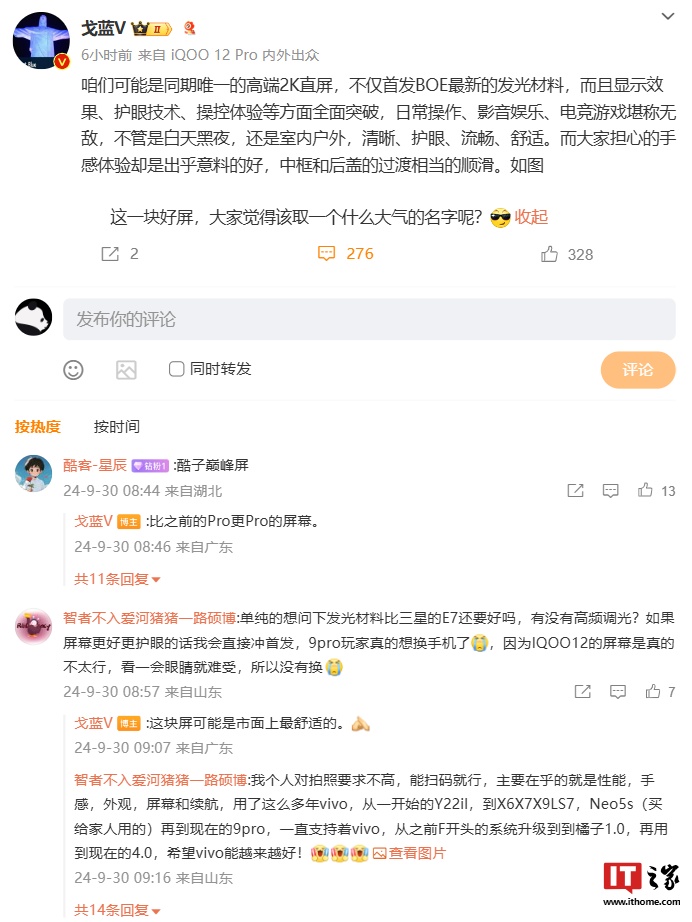 IT之家 9 月 30 日消息,iQOO 产品经理 @戈蓝V 今日在微博透露,iQOO 13 将配备高端 2K 直屏,首发京东方最新一代发光材料。