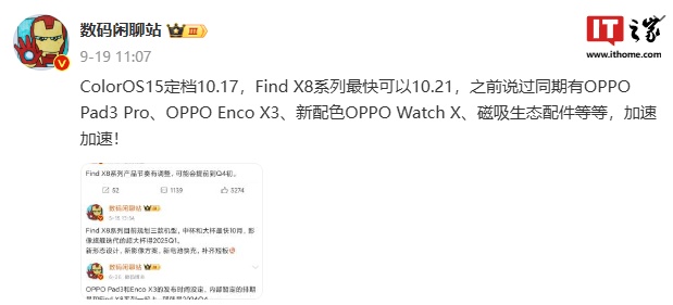 在 OPPO 官宣 2024 开发者大会定档 10 月 17 日之后,博主 @数码闲聊站 曾爆料称:“Find X8 系列最快可以 10 月 21 日”,同期有 OPPO Pad 3 Pro、OPPO Enco X3、新配色 OPPO Watch X、磁吸生态配件等。