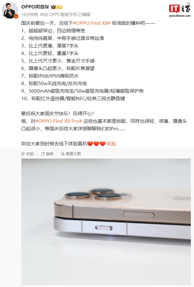 IT之家 9 月 30 日消息,OPPO Find 系列产品负责人周意保今日在微博对 Find X8 标准版“爆料”进行了汇总,并称 Find X8 Pro 这些也基本都是标配。