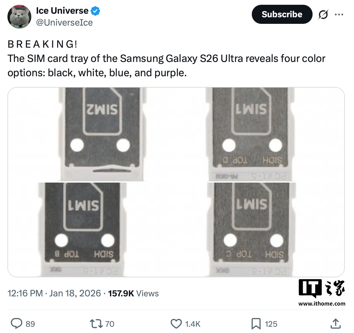 IT之家 1 月 19 日消息,消息源 @i冰宇宙 在 X 平台发布了 Galaxy S26 Ultra 系列手机 SIM 卡托的图片,从图片中可以看到系列机型将提供黑色、白色、蓝色、紫色四种颜色,不过没有此前网传的橙色配色。对此,外媒 SamMobile 认为三星可能不会将橙色作为这款设备的主打颜色,只会在官网限量发售。