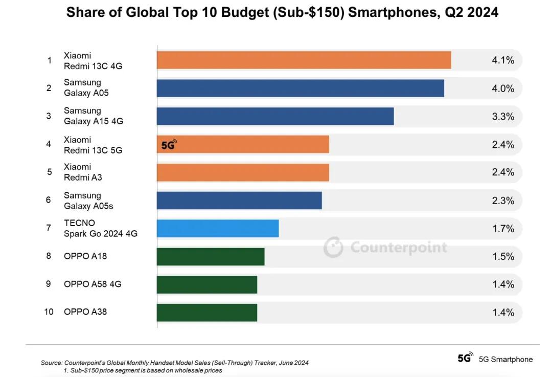 根据Counterpoint的数据可知,在入门手机市场,Redmi 13C 4G 是当季全球销量第八的机型,并且是唯一上榜的国产手机。