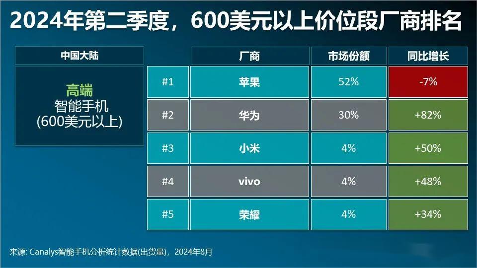 据Canalys数据显示,2024年第二季度,在中国大陆地区,虽然苹果在高端手机市场还是以52%的市场份额,位于第一,但却下跌了7%。而排在第二至第五的华为、小米、vivo和荣耀,则分别暴涨了82%、50%、48%和34%。也就是说,国产手机厂商正以集群力量逐步蚕食苹果占据的高端市场。