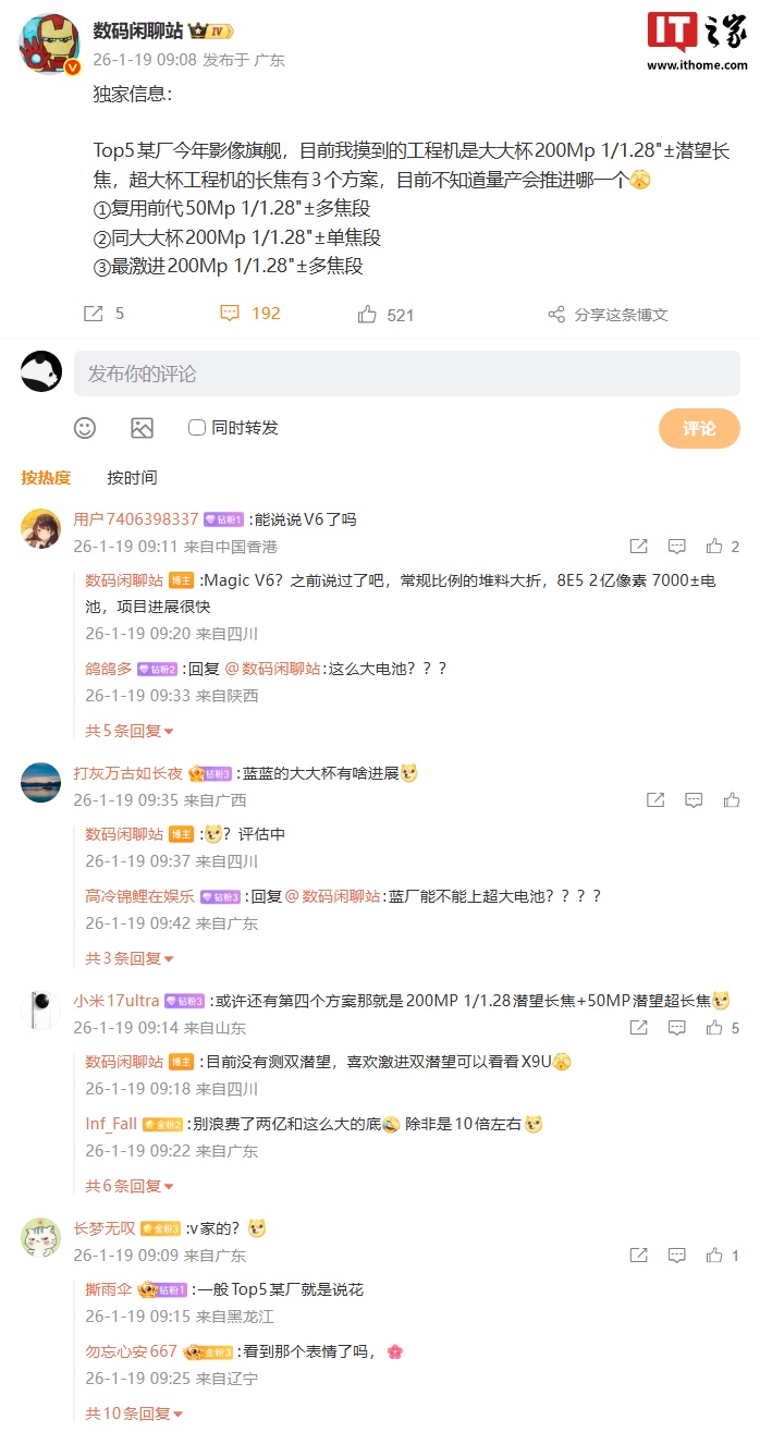 IT之家 1 月 19 日消息,博主 @数码闲聊站 今日发文透露,Top5 某厂今年影像旗舰,目前摸到的工程机是大大杯搭载 200Mp 1/1.28"± 潜望长焦,而超大杯工程机的长焦有 3 个方案(目前不知道量产会推进哪一个):