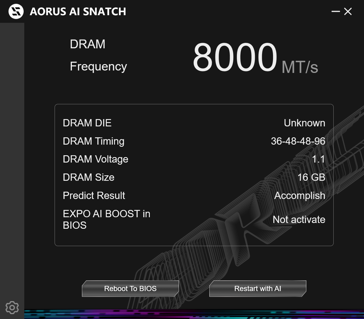这里需要注意的是,如果在使用 AI SNATCH 超频工具之前,已经通过主板 BIOS 进行手动超频和小参调整,那么建议大家不要直接点 Restart with AI 直接覆盖内存设置,而是点击 Reboot to BIOS,进入 BIOS 菜单先恢复出厂默认参数再进行 AI 超频。