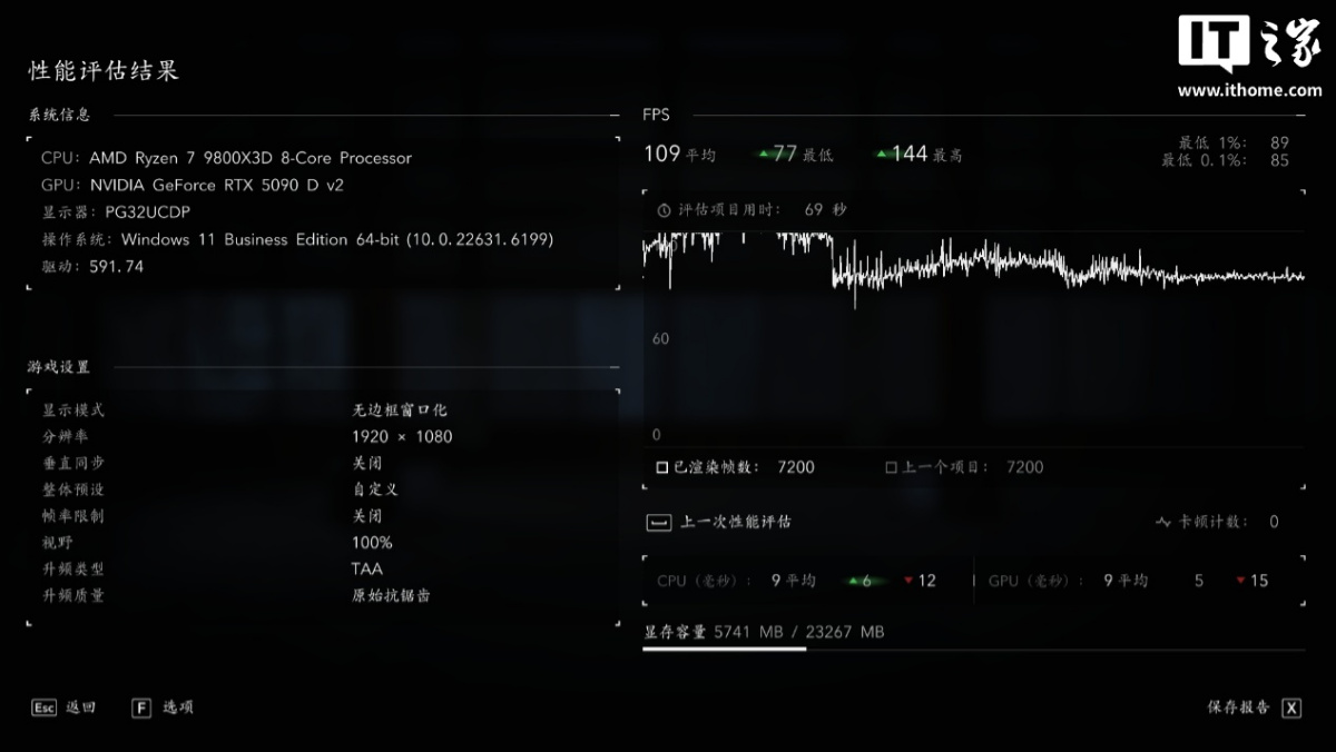 锐龙 7 9800X3D 在「极限游戏」模式下游戏平均帧数为 109 帧,1% Low 为 89 帧;