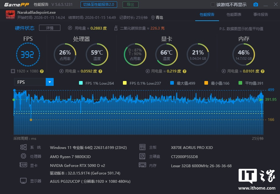 锐龙 7 9800X3D 在「极限游戏」模式下游戏平均帧数为 392 帧,1% Low 为 264 帧;
