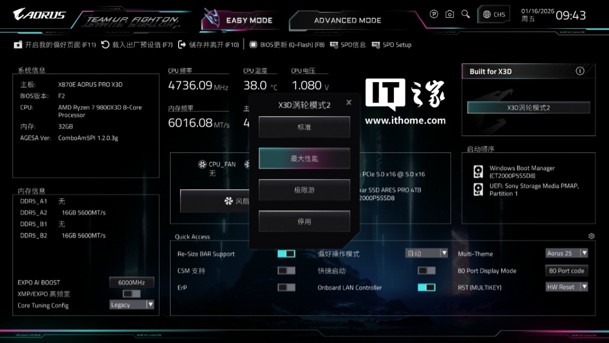 还记得四个月前,IT之家给大家带来了技嘉 X870E X3D 超级冰雕主板的体验评测,它是技嘉专为 X3D 处理器平台打造的首发高端旗舰主板之一,其搭载的全新 X3D 鸡血模式 2.0 功能,在性能提升方面令人印象深刻,可以说是 X3D 系列处理器的最佳“外挂”。