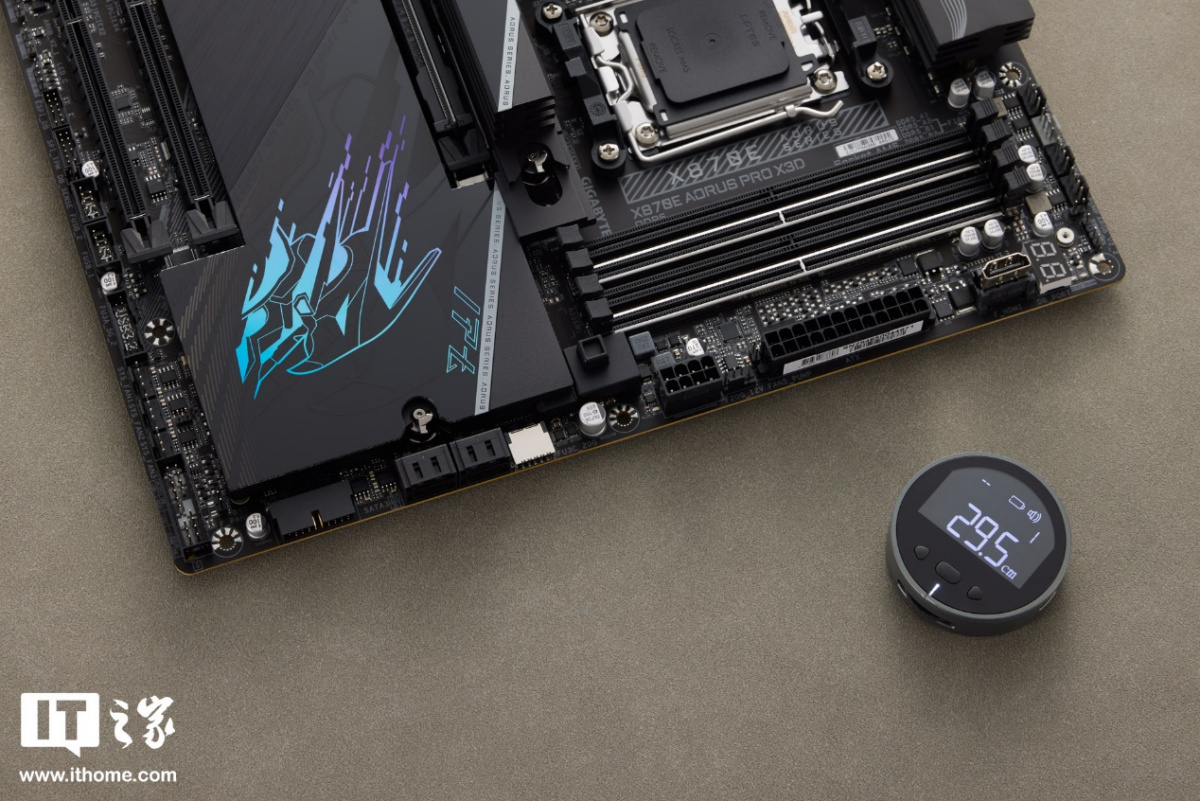 尺寸方面,技嘉 X870E X3D 电竞雕主板是标准的 ATX 大板,长宽为 28.2*29.5cm,重量约 2.43kg。