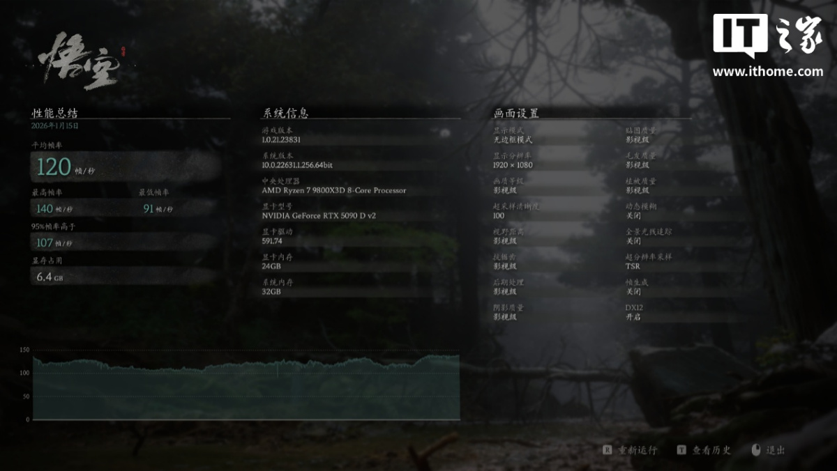 第五款游戏是《黑神话:悟空》,以 1080P 分辨率 + 影视级画质 + 100% TSR 超采样预设,运行游戏自带基准测试: