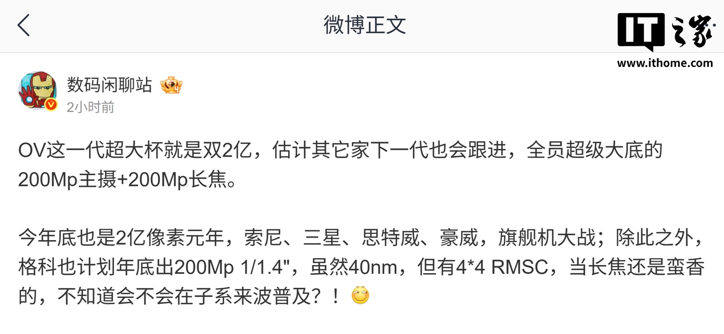 IT之家 1 月 19 日消息,博主 @数码闲聊站 今天在微博表示,“OV”(OPPO、vivo)这一代的超大杯机型将搭载双 2 亿镜头,其他家预计会在下一代跟进,形成“全员超大底 2 亿像素主摄 +2 亿长焦”格局。