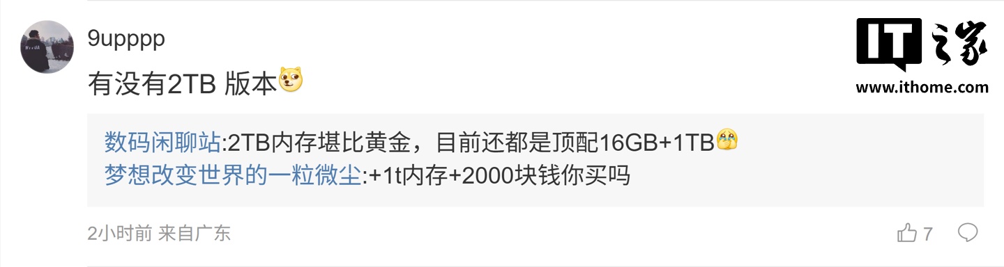 后续有用户在评论区询问:“x9u 的 10x 底是多少来着,1/2 吗”,博主回复道:“50m 小底方案,懂自懂”;另一名用户则询问道:“有没有 2TB 版本”,博主表示:“2TB 内存堪比黄金,目前还都是顶配 16GB+1TB”。