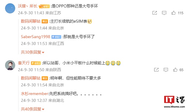 博主 @数码闲聊站 今日在微博评论区下就该手表与网友互动,针对新款手表定位,博主称“主打长续航的 eSIM 表”。针对小米小平板的上市情况,博主透露“明年啊,但性能期待不要太多”。