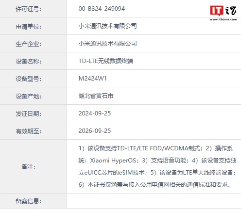 IT之家 9 月 30 日消息,型号为 M2424W1 小米新品在工信部完成入网,搭载 Xiaomi HyperOS,支持独立 eUICC 芯片的 eSIM 技术。