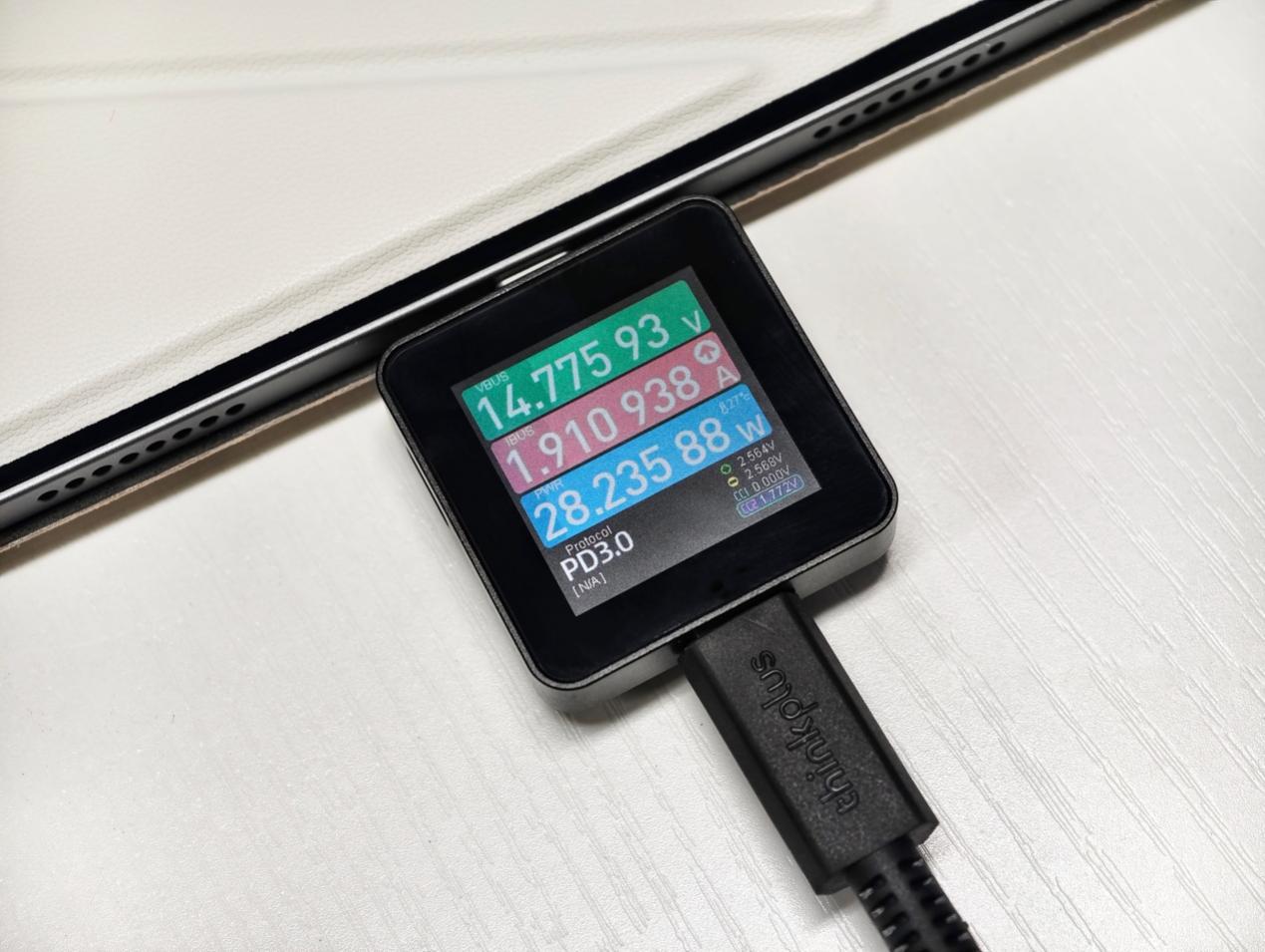 在 iPad Pro 2021 款(M1 芯片)充电测试中,触发 PD3.0 快充,但未显示具体功率,实际充电功率为 14.7V 1.9A 28W,充电后期功率会下降到 15W-12W。