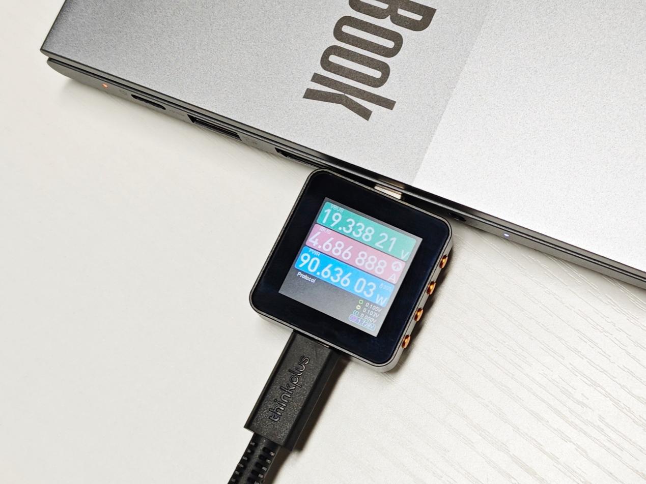 在 ThinkBook 16 + 的充电测试中,未显示具体快充协议,不过实际充电功耗达到了 19.3V 4.6A 90W,且一直能够保持该功率充电至显示电量 100%。