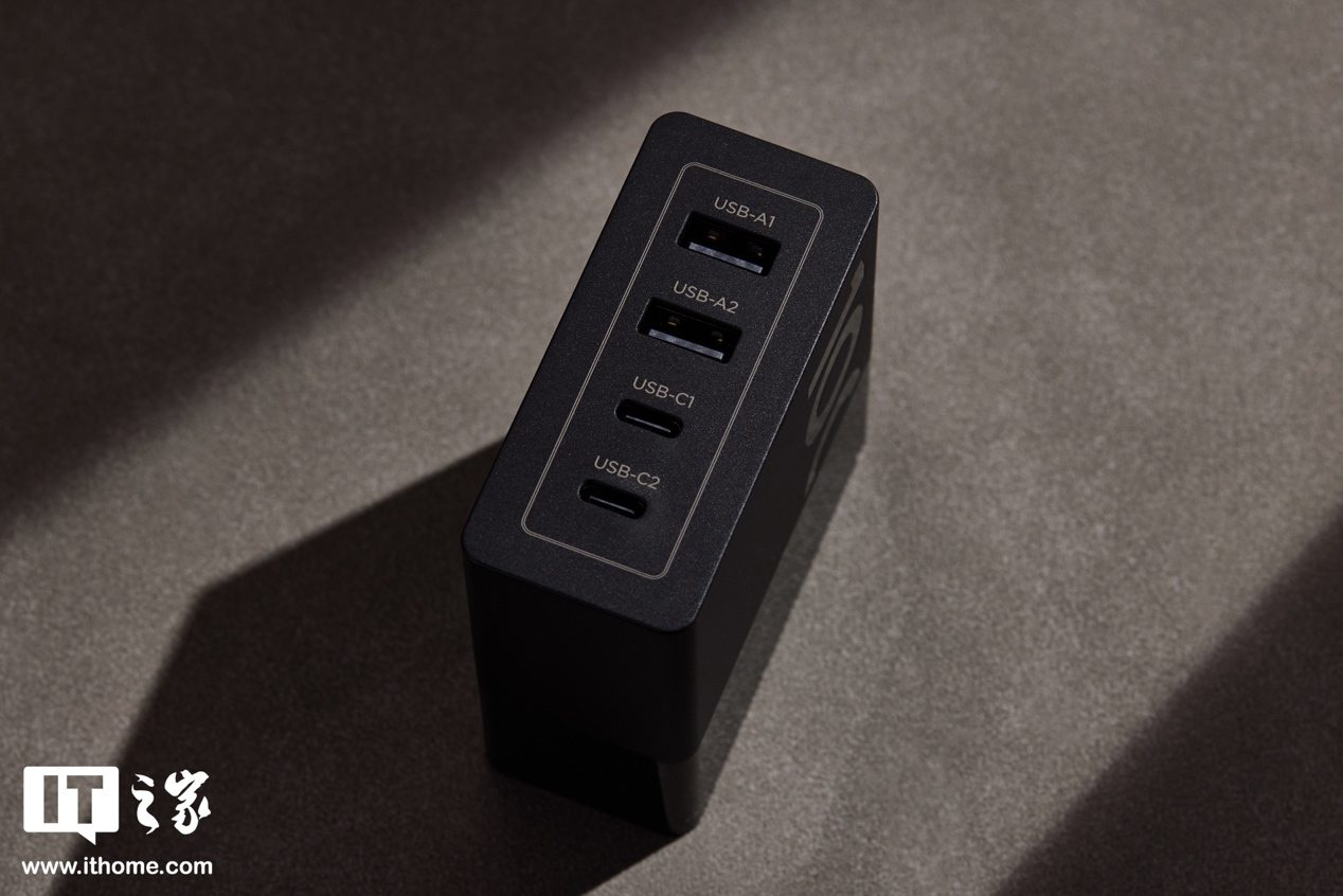 100W 版本充电器配备了 2*USB-A 口加 2*USB-C 口的组合,接口排列规整,间距充分,最多允许用户同时为四台设备进行充电。