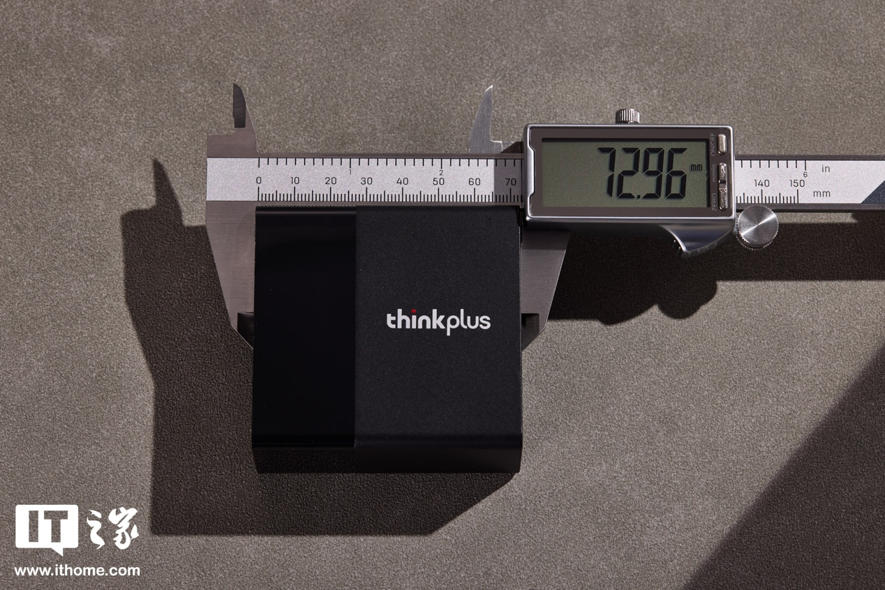 尺寸方面,联想 thinkplus 光影氮化镓 100W 多口充电器的官方数据是 70*73*31mm,IT之家通过游标卡尺对其三围进行实际测量,为 70*72.9*32.1mm。