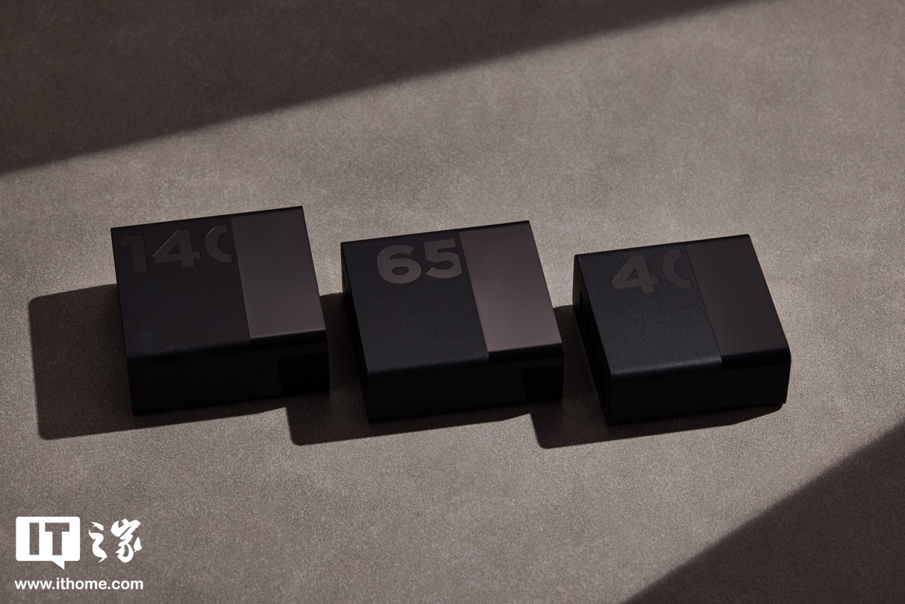 而充电器本体则采用了经典的黑白配色来诠释“光影”这个系列主题。从上面两张图中可以看到 12W 充电器的体积最为小巧,20-30W 充电器的大小较为接近,40W-140W 充电器的体积则要更大一些。