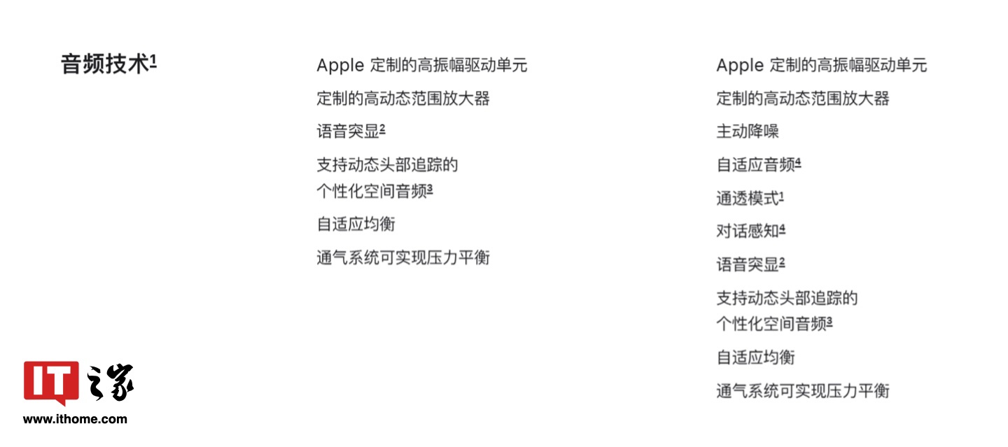 AirPods 4 主动降噪款与便宜 400 元的普通款相比,虽然都搭载相同的 H2 芯片,但是新增了主动降噪、自适应音频、通透模式、对话感知功能,耳机盒也支持了无线充电。