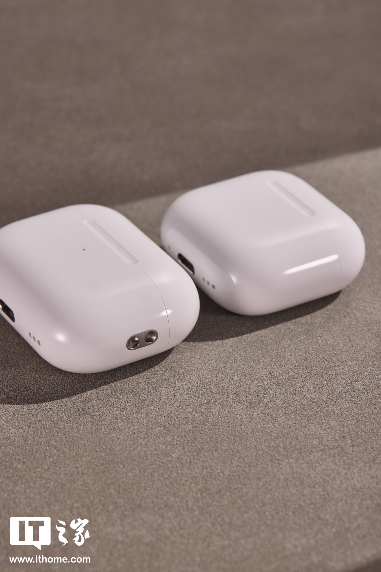 C 口旁边便是与 AirPods Pro 2 相同的扬声器开孔,便于查找耳机盒。不过 AirPods Pro 2 上的挂绳孔并没有在 AirPods 4 上出现。