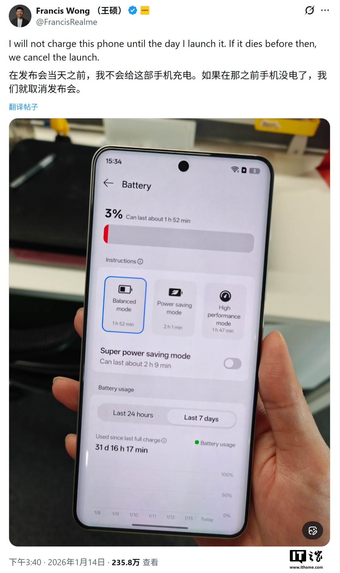 realme 产品营销负责人王硕于 1 月 14 日在社交平台 X 上发布了一张疑似 P4 Power 的电池使用截图,展示了该机在“均衡模式”下惊人的续航时长。