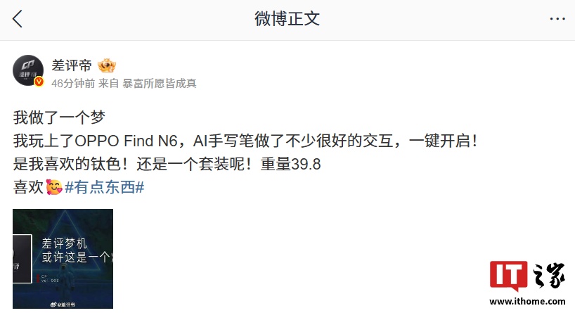 IT之家 1 月 20 日消息,博主 @差评帝 今日发文透露,OPPO Find N6 折叠屏手机与 AI 手写笔做了不少很好的交互,支持一键开启特性。另外,新品还拥有钛色,提供套装可选,重量 39.8(具体单位未明说,预计指手写笔的重量)。