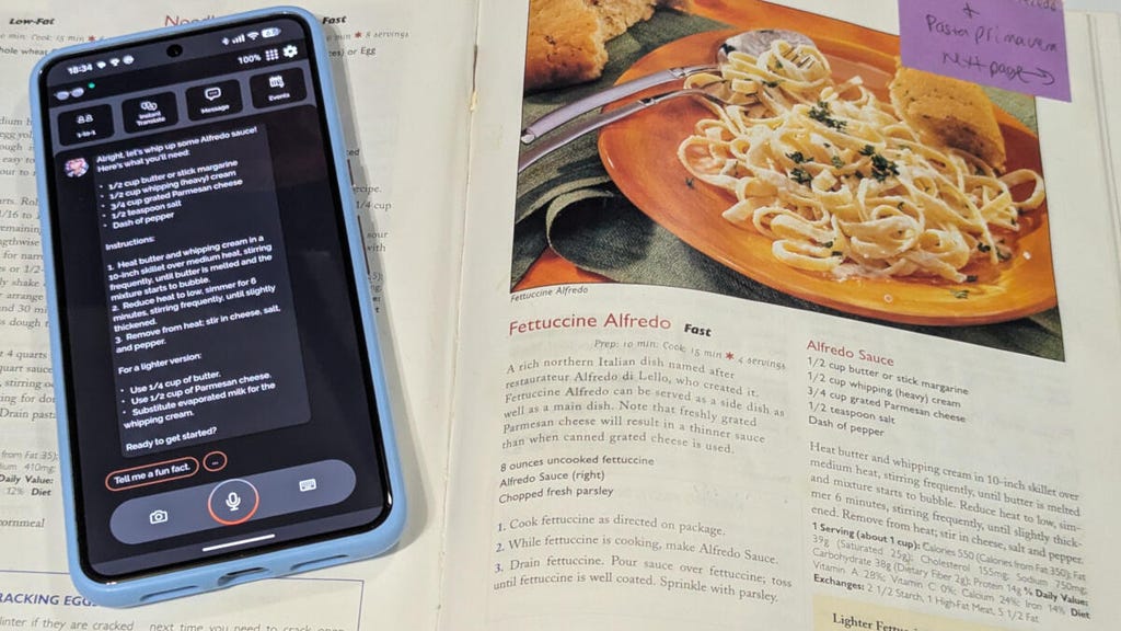 我从贝蒂·克罗克(Betty Crocker)的《新娘版烹饪书》中选择了一个简单的阿尔弗雷多酱食谱,我每个月至少制作一次。智能眼镜不仅准确地捕捉到了所有的食材和步骤,还帮助我同时管理了三道菜以完成一餐。例如,我先开始制作酱汁,然后再做鸡大腿和一份简单的配菜沙拉。