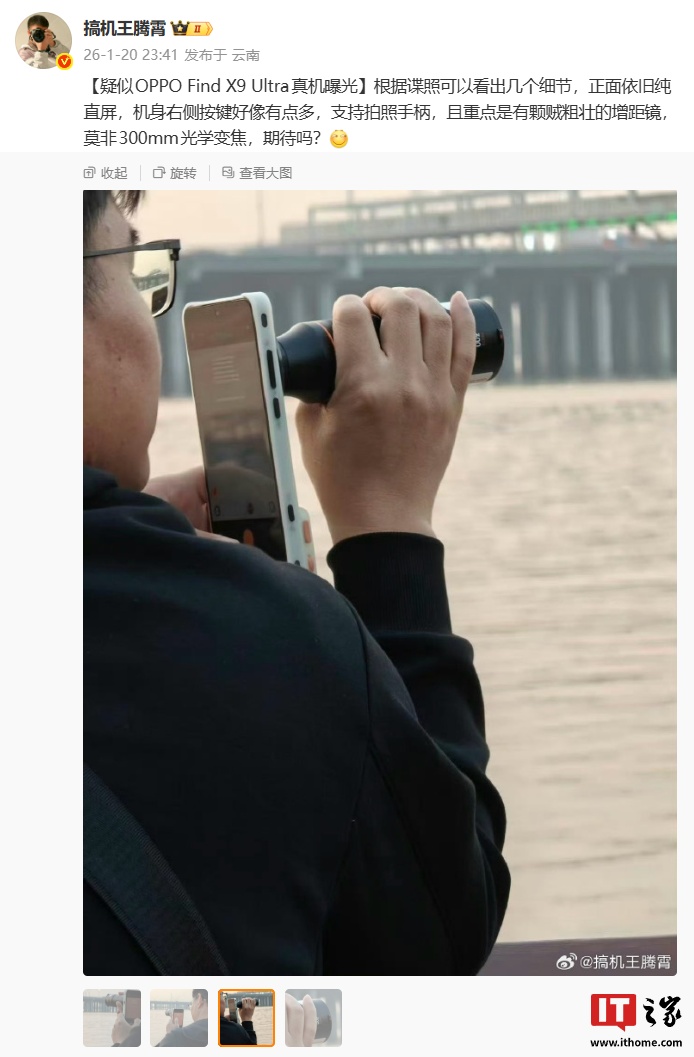IT之家 1 月 21 日消息,博主 @搞机王腾霄 昨晚分享了 OPPO Find X9 Ultra 的真机谍照。图片显示,新机正面依旧纯直屏,支持拍照手柄,机身右侧配备多枚按键,画面还重点展示了一颗体型“硕大”的增距镜(博主猜测有望支持 300mm 光学变焦)。