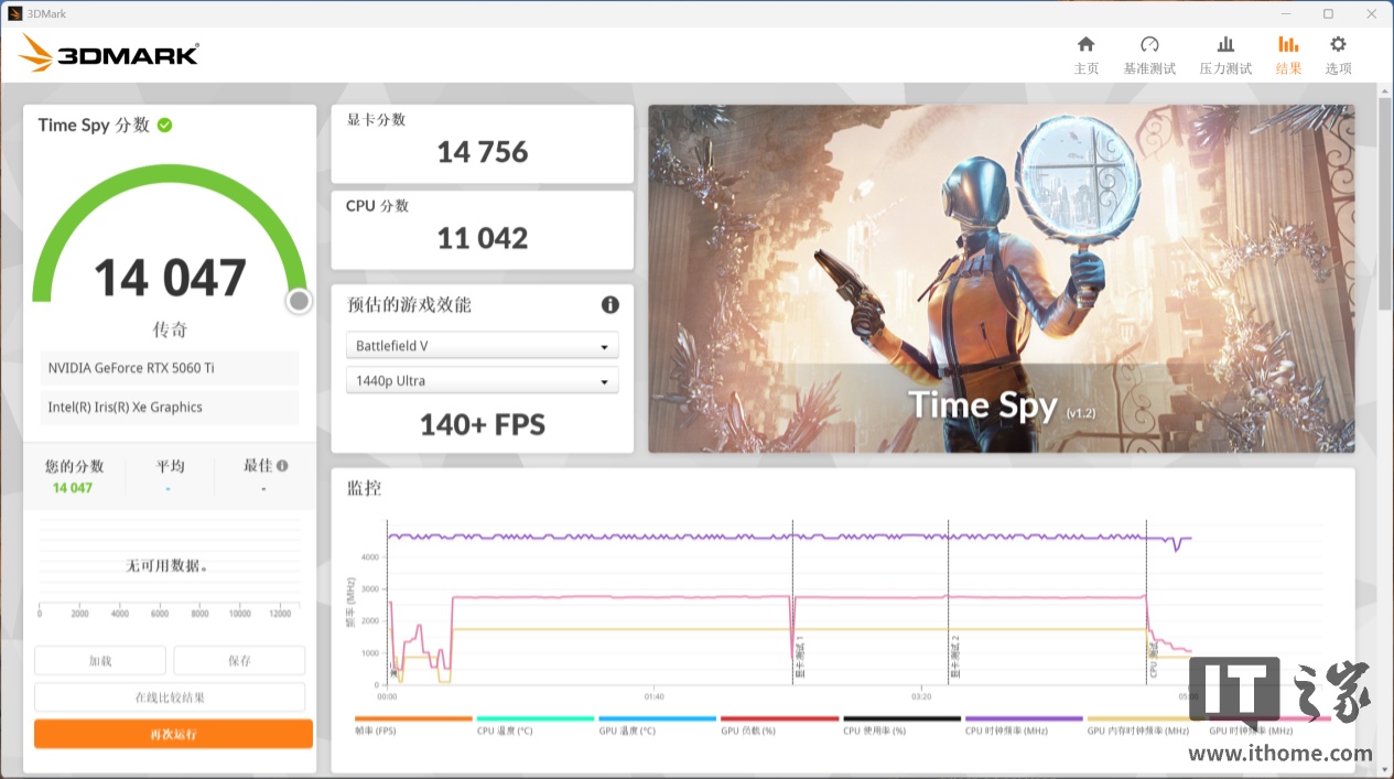IT之家先是关闭笔记本内建显示器,使用外接显示器进行 3DMark Time Spy 测试,其显卡分数达到 14756,与我们此前测试的 RTX 5060Ti 16GB 显卡分数相差约 1000 分,性能损耗约 6%,考虑到 CPU 与此前测试机的性能相差太大,会对测试分数有些影响,实际的性能损耗应该会更小一些。