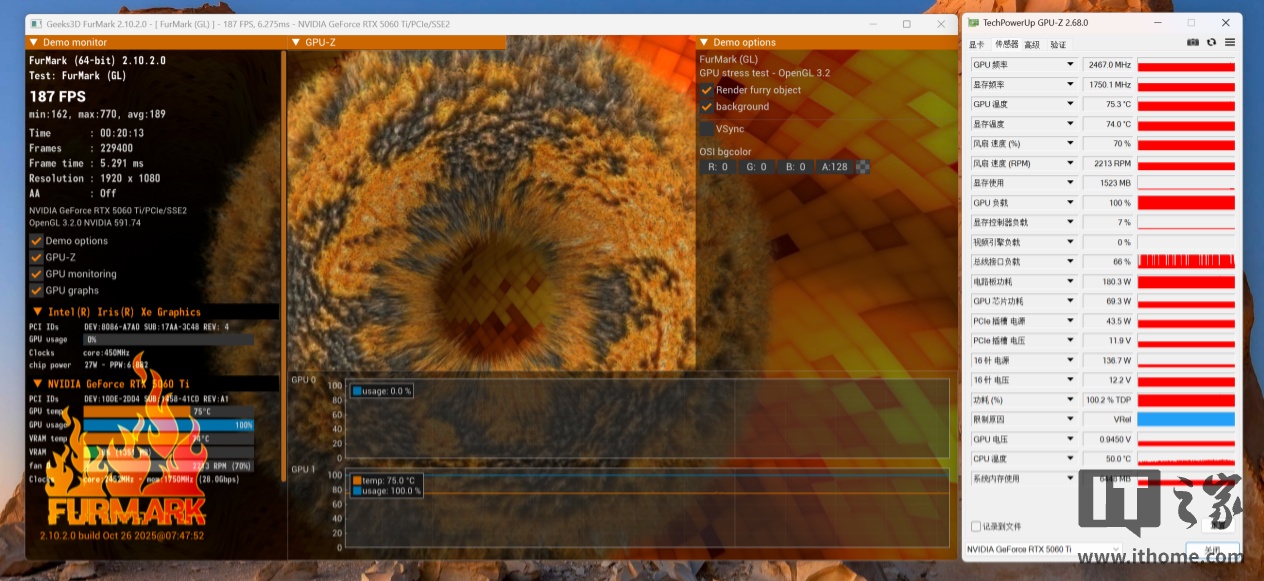 IT之家先对其做了单烤测试,测试环境室温约为 20°C,在 20 分钟单烤结束后,显卡依旧是 180W 满载运行,此时 GPU 频率为 2467MHz,GPU 温度为 75.3°C,显存温度为 70°C,作为一款双风扇设计的小巧显卡来说,这个成绩还不错,运行十分稳定。