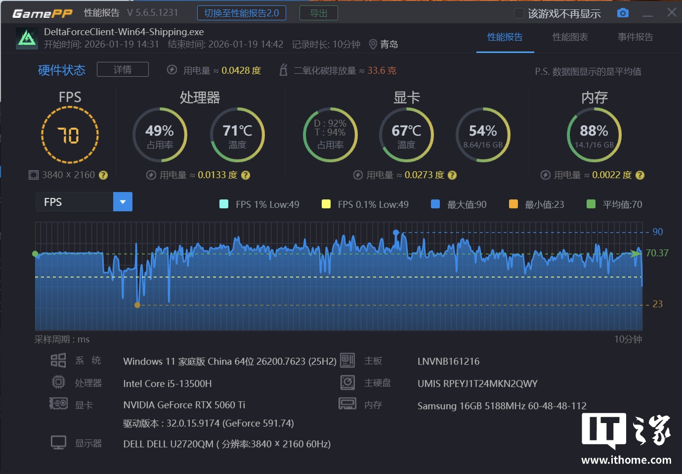 在 2K 分辨率 + 全高画质下,进行一场全民战场模式对战,《三角洲行动》的游戏平均帧数为 70 帧,1% Low 帧 49 帧。