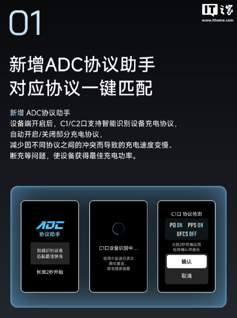 更新后设备端 USB-C1/C2 接口支持智能识别设备充电协议,自动开启 / 关闭部分充电协议,减少因不同协议之间的冲突而导致的充电速度变慢、断充等问题,使设备获得最佳充电功率。