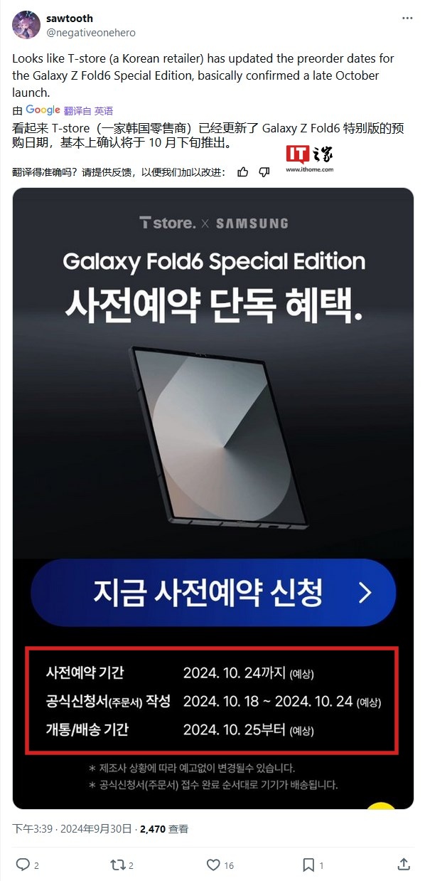 IT之家 10 月 1 日消息,科技媒体 Android Headline 昨日(9 月 30 日)发布博文,报道称三星 Galaxy Z Fold 特别版已现身印度官网,相关消息还显示该机 10 月 18 日发布,10 月 24 日接受预订,10 月 25 日开始发售。