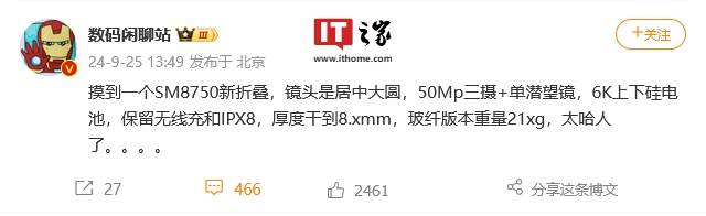 IT之家附上该微博内容如下:“摸到一个 SM8750 新折叠,镜头是居中大圆,50Mp 三摄 + 单潜望镜,6K 上下硅电池,保留无线充和 IPX8,厚度干到 8.xmm,玻纤版本重量 21xg,太哈人了....”