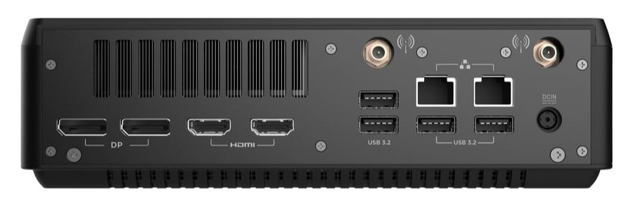 外部 I/O 接口方面,其正面提供 1 个 USB-C 40Gbps、1 个 USB-A 3.2、1 个二合一音频插孔;反面则包括 2 个 DisplayPort 1.4、2 个 HDMI 2.1、4 个 USB-A 3.2、2 个 2.5GbE RJ45 和一对 Wi-Fi 天线插孔。