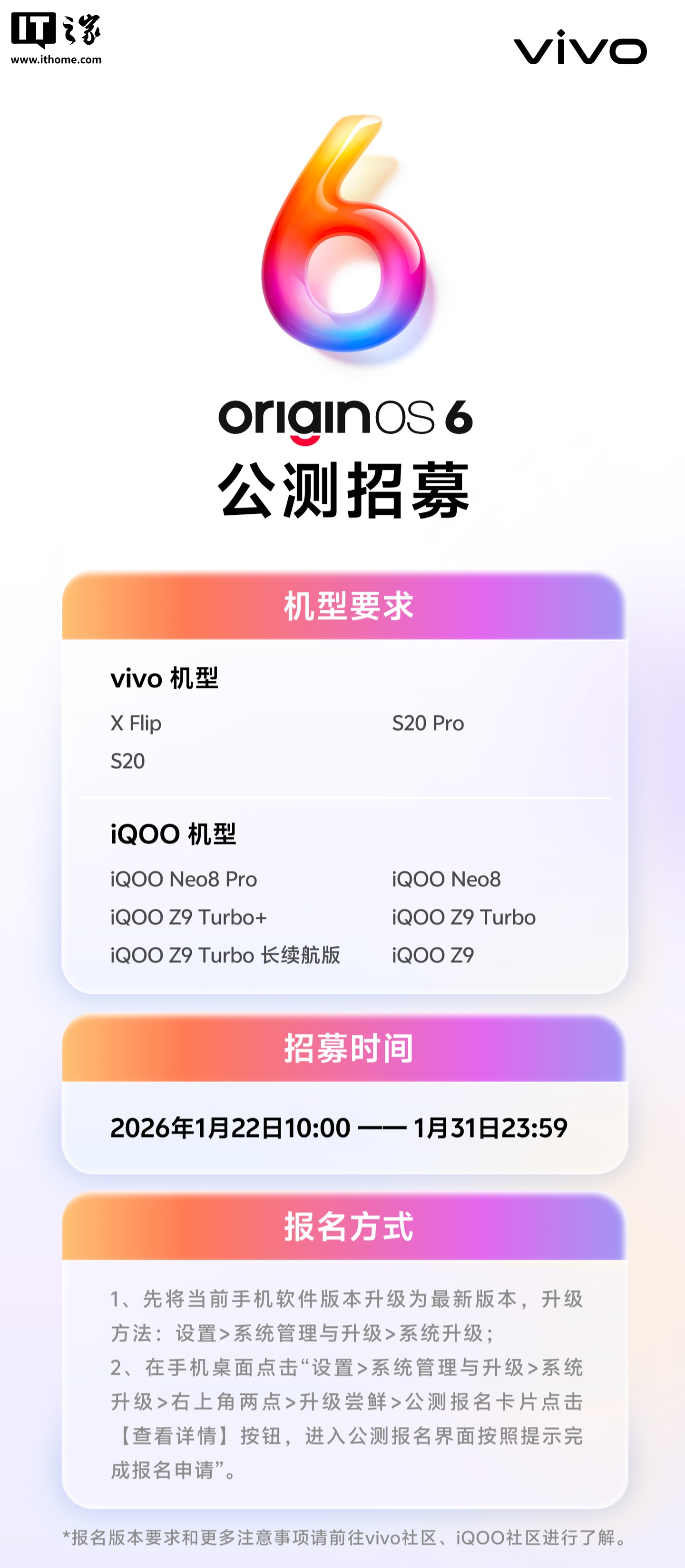 IT之家 1 月 22 日消息,全新 OriginOS 6 系统今日官宣开启新一轮公测招募报名,覆盖 vivo S20、iQOO Neo8 系列等机型。