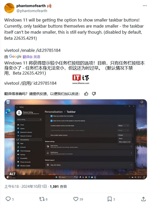 IT之家 10 月 1 日消息,消息源 @PhantomOfEarth 今天(10 月 1 日)在 X 平台发布推文,报道称在 Windows 11 Beta Build 22635.4291 预览版更新中,引入了“显示较小任务栏图标”选项。
