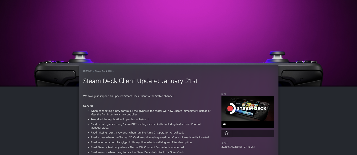 IT之家 1 月 22 日消息,V社昨天为旗下 Steam Deck 掌机推出更新,主要改进手柄支持,并修复了多项小 Bug。