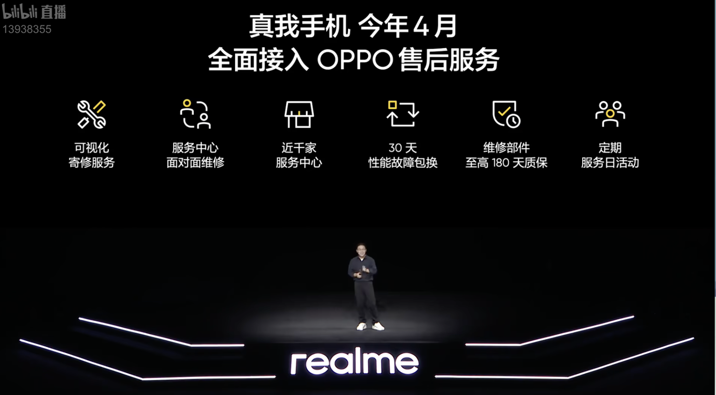 据介绍,在接入 OPPO 售后服务后,用户持 realme 真我手机可享 OPPO 门店可视化寄修服务、服务中心面对面维修、近千家维修中心、30 天性能故障包换、维修部件至高 180 天质保、定期服务日活动。