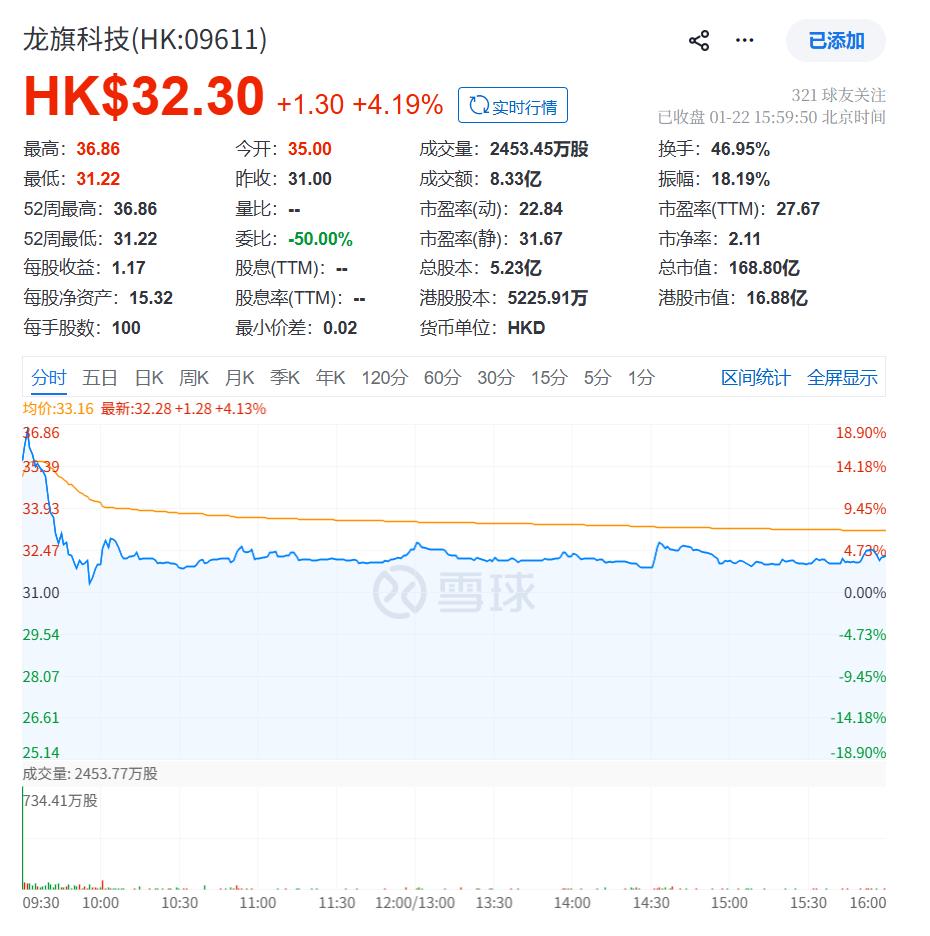 上市首日,龙旗科技开盘价为35港元/股,截至今日收盘,龙旗科技股价报32.30港元/股,较发行价涨4.19%,总市值168.8亿港元。