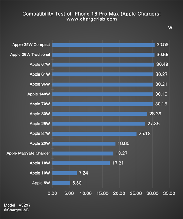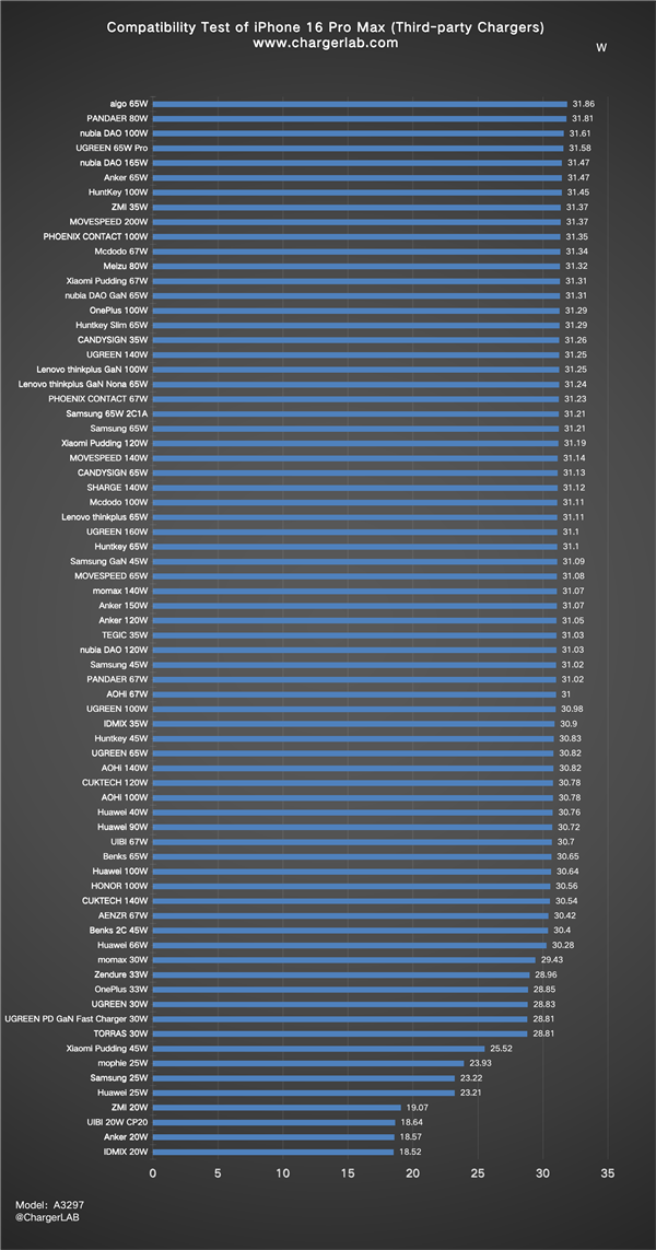 这些充电器都可以兼容iPhone 16 Pro Max,但最大功率也只有30W出头,足以证明这就是极限了。