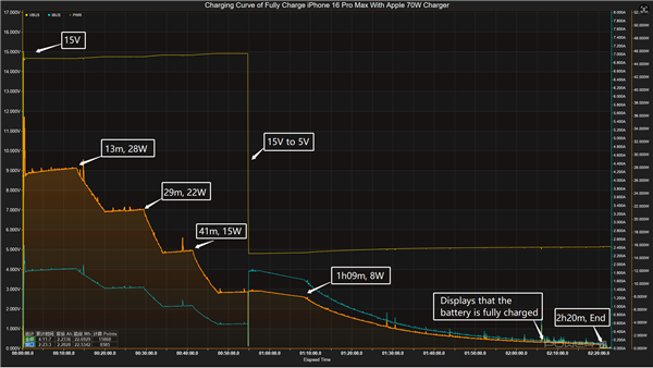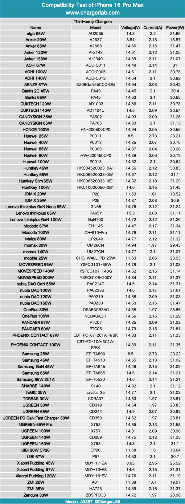 对此,ChargerLab搭配一系列苹果、第三方充电器,详细测试了iPhone 16 Pro Max的充电功率。