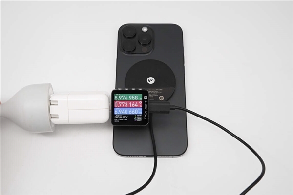 苹果MagSafe充电器最大功率约18.28W,电压接近9V,电流约2A。