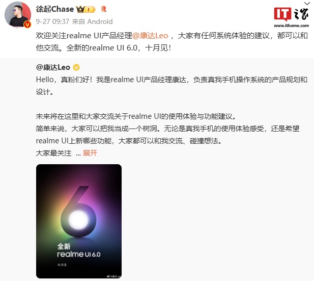 在此之前,真我副总裁、全球营销总裁、中国区总裁徐起 9 月 27 日发文称,全新的 realme UI 6.0 十月见。而 realme UI 产品经理 @康达Leo 微博账号已经上线,其负责真我手机操作系统的产品规划和设计。