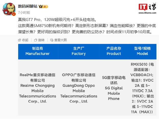 IT之家 10 月 1 日消息,一款型号为 RMX5010 的 realme 新机于 9 月 30 日通过了 3C 认证,博主 @数码闲聊站 透露该机为真我 GT7 Pro,搭载 120W 闪充 + 6 开头硅电池,“时间点保 11 月初争 10 月底”。