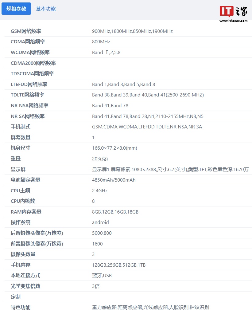 该机的 CPU 主频 2.4GHz,RAM 提供 8GB、12GB、16GB、18GB 四个版本,存储空间提供 128GB、256GB、512GB、1TB 四个版本。此外,该机后置 5000 万像素、800 万像素双摄,前置 1600 像素镜头。